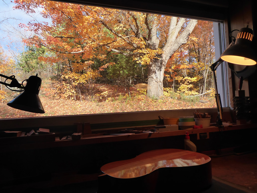 For over 45 years I’ve looked up from my work bench to see this scenery change from the colors of the fall to the white of the winter months and the new green of springtime. It’s a seasonal and work cycle I’ve experienced so many times and I’m sure it has some influence on the guitars I’ve built in this space.